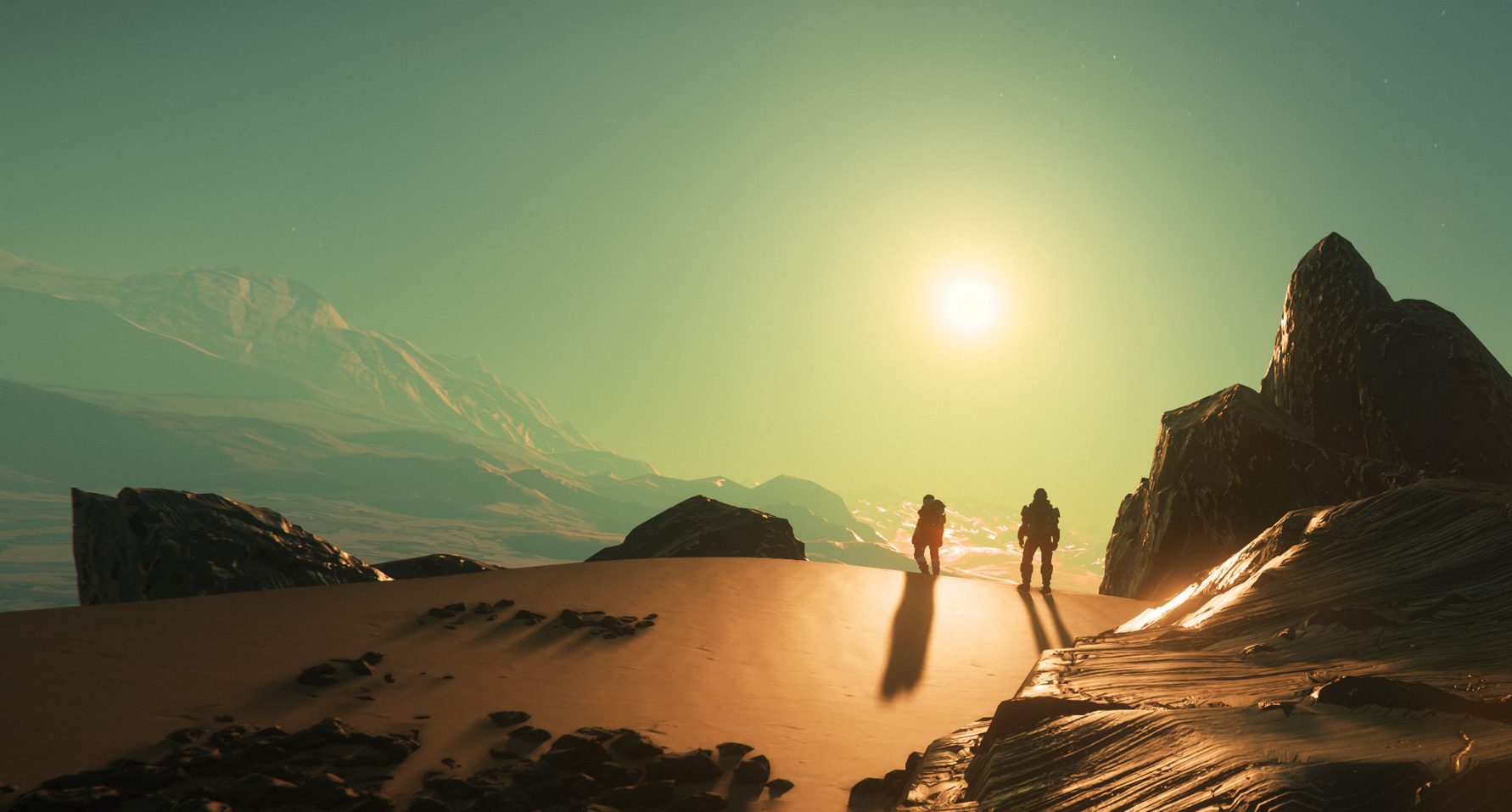 Wir sind am Anfang eines fast die halbe Kugel dieses Mondes umfassenden, einfach unfassbar riesigen tektonischen Grabensystems gelandet. Es hat mir wirklich die Sprache verschlagen. Ich weiß nicht... irgendjemand sprach von einer „Interstellaren Axt“, die hier eingeschlagen wäre. Mir kamen da ganz andere Sachen in den Sinn. Ich musste sofort an meine Untersuchungen der Aberdeen Wall denken. Eine ähnliche mächtige Erscheinung. Weiß Gott, dieser Graben sprengte alle meine Vorstellung von Gigantismus! Wir haben uns dort einen Landeplatz gesucht. Verhältnismäßig flach am Anfang des Grabens, so dass auch die großen Raumschiffe da landen konnten. Es gab einfach kein Halten. Alle mussten die Schiffe verlassen und loslaufen. So schön war der Anblick. Nicht schön im Sinne von irgendeiner faszinierenden Botanik, aber es waren die Felsformationen, die oberflächliche Beschaffenheit der Gesteine und dieses unfassbar wunderschöne Morgenlicht des aufgehenden Pyrosterns. Ehrlich! So wie an diesem Tag habe ich noch nie in meinen Helm hinein gesabbert!