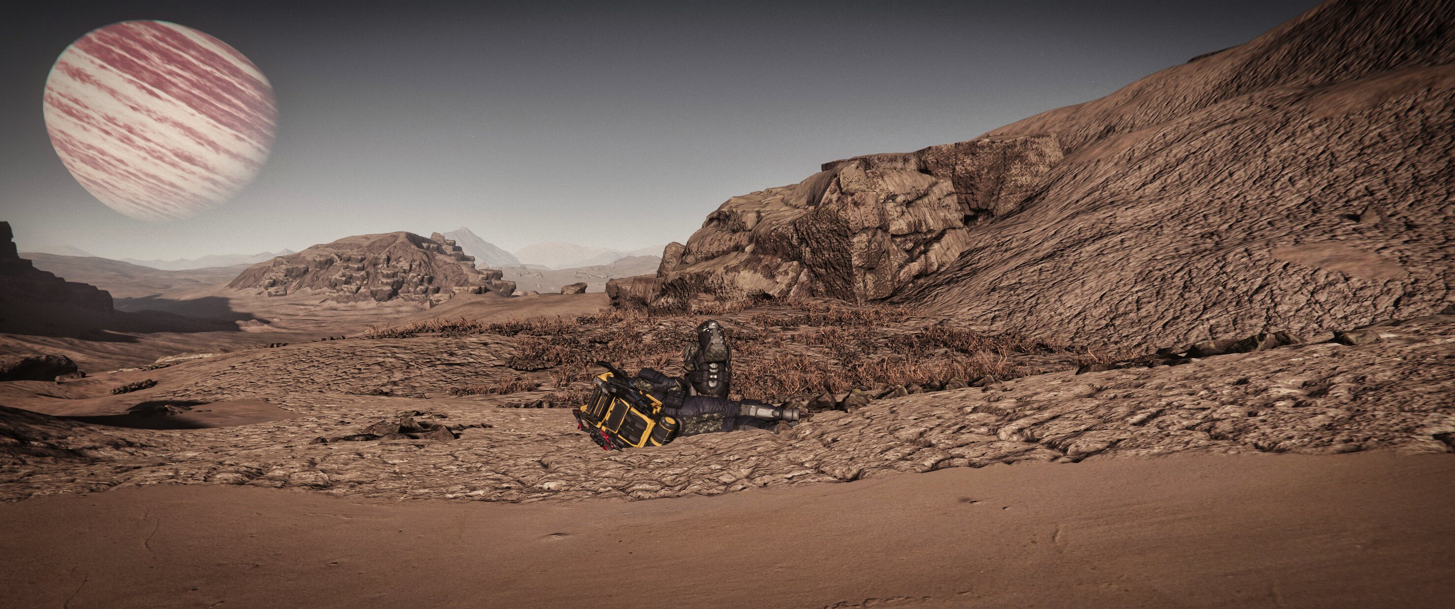 Wie die Wahnsinnigen rannten wir mit unserer Beute aus der Station und einen sandigen Hang hinauf. Was wir da oben wollten, war mir eigentlich nicht klar. Die schöne Aussicht genießen? Wir kämen doch sowieso nicht mehr hier weg. Dennoch lief ich mit. Friedrich, der deutlich schlechter aussah als ich, gab Gas, als wäre es das letzte Mal gewesen. Mir ging die Puste aus, obwohl die Sauerstoffvorräte meines Morozovs noch mehr als ausreichend waren. Schließlich kamen wir auf dem Plateau an, von wo aus wir einen herrlichen Blick über die Station und die sandigen Berge dieses wirklich schönen Wüstenmondes hatten. Pause! Ausruhen! Schwer atmend setzte ich mich an einen Felsen: „Leute, ich kann nicht mehr. Ich bin völlig am Ende!“ Pike und Bru waren schon weiter gelaufen. Friedrich war noch bei mir, aber er stand.