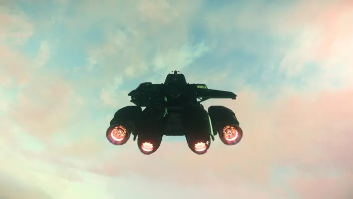 An der Seite des Hangars wartete das Schiff, das ihm mehr bedeutete als jedes andere in der Flotte: eine gewaltige, grün lackierte Drake Caterpillar. Ihre markante Form war unverwechselbar – roh, industriell, kompromisslos.