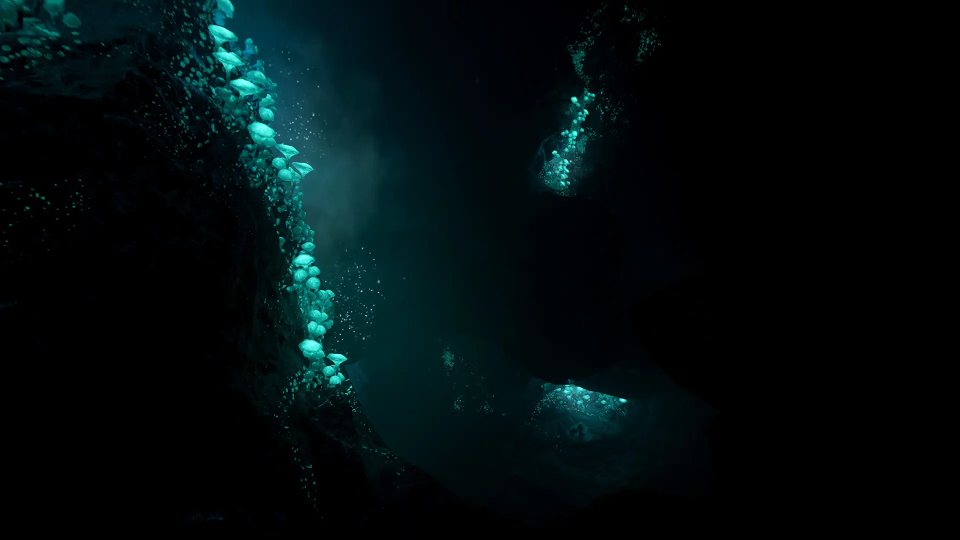 Am Höhlenrand angekommen sah ich, woher das Glimmen kam. Einige Pilzkörper lumineszierten in einem sanften Blau.