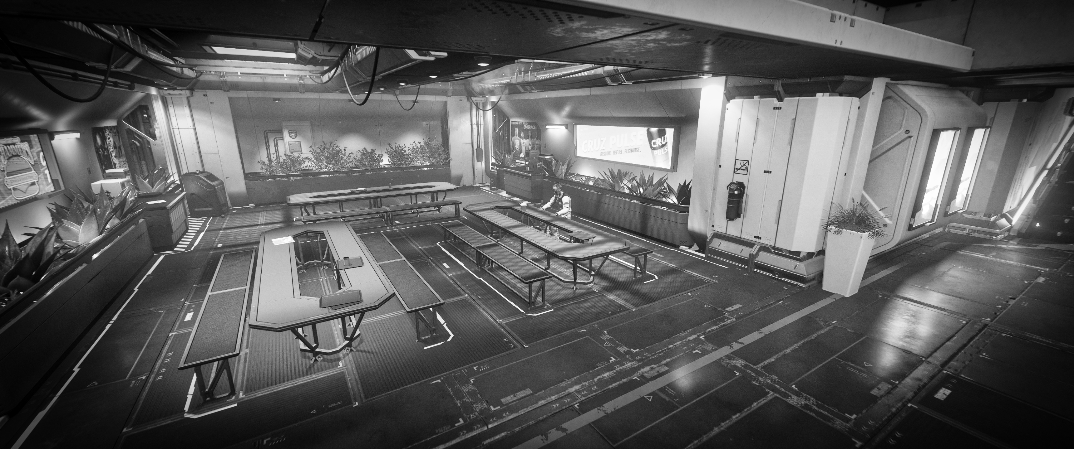 Wir beschlossen, den Abstecher in die Xenotech-Halle nun doch noch zu wagen. Als wir erneut die Empore betraten, öffnete sich uns der Blick in die Halle. Dort, am Ende des Saals, thronte finster der Vanduul-Jäger nach wie vor über diesem seltsamen kastenförmigen Behälter.