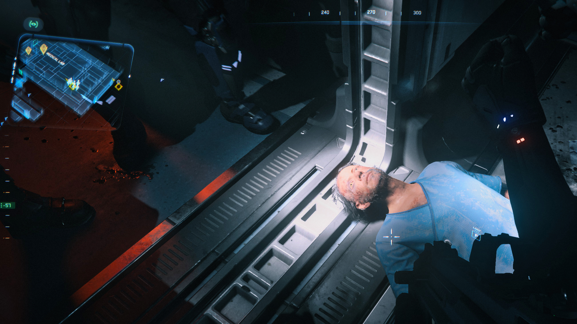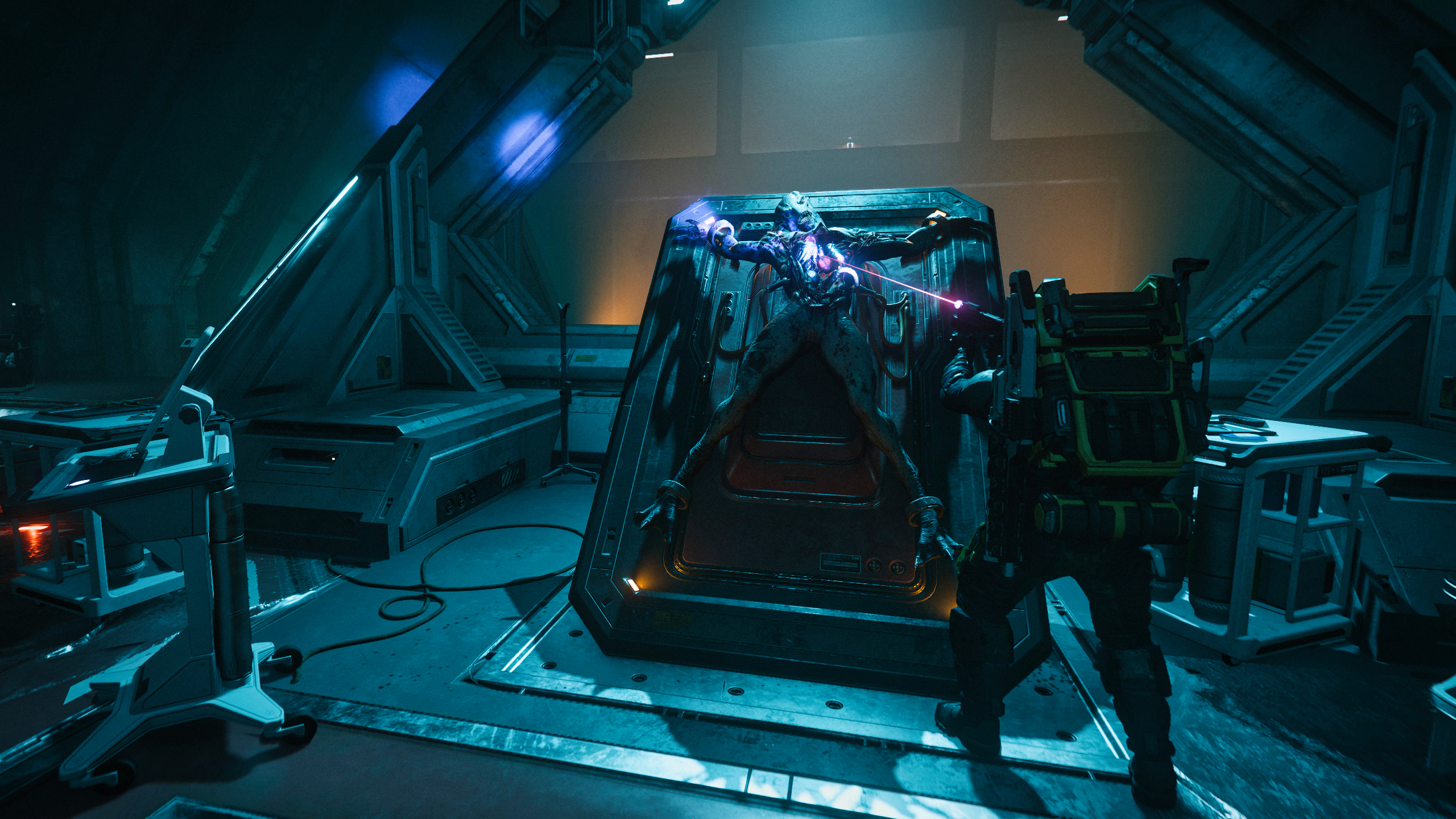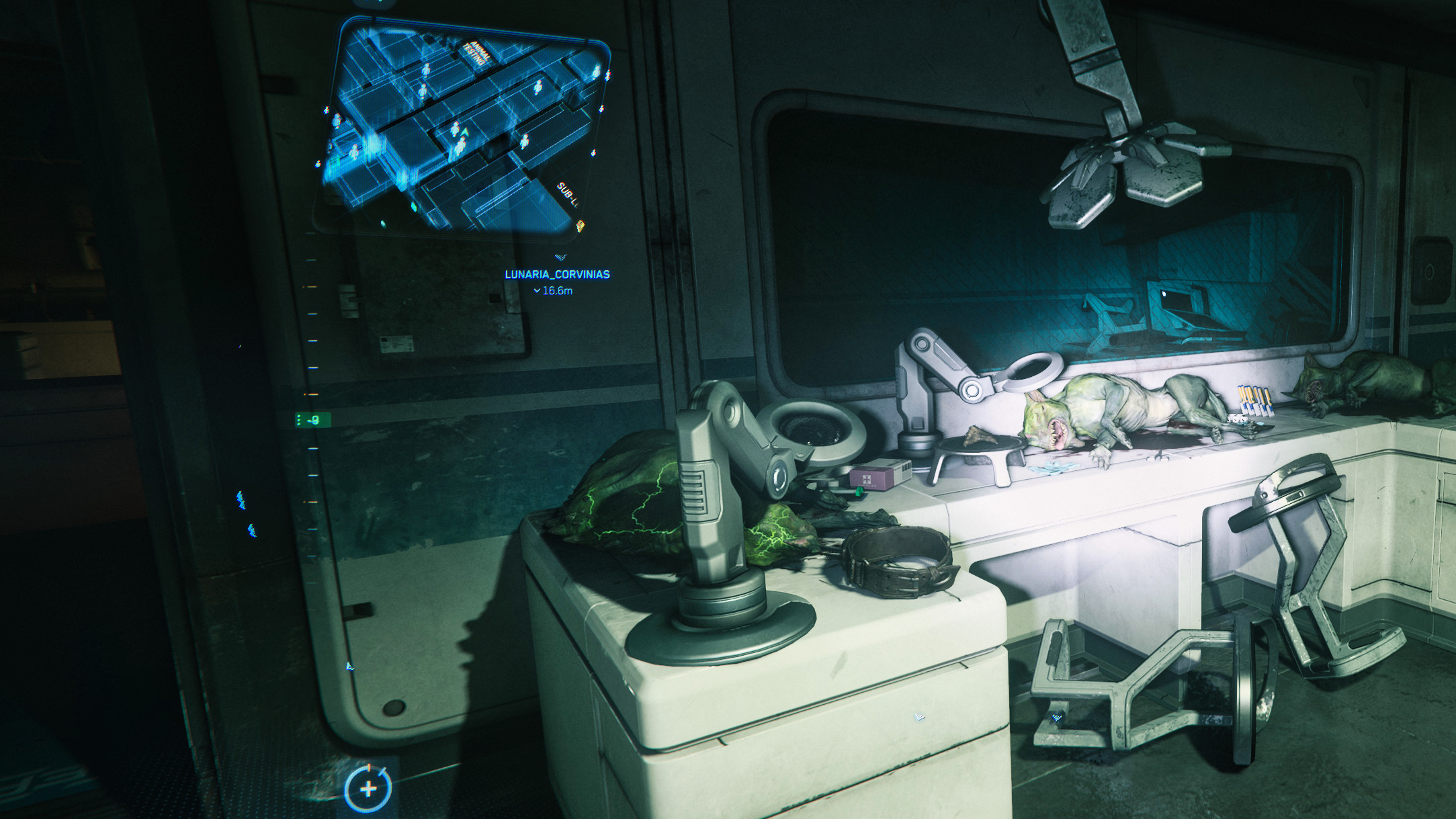 Mein Blick schweifte über eine Halle, in deren Mitte eine metallene Platte aufgebaut war, auf der tatsächlich ein Vanduul-Leichnam befestigt war. Bildschirme auf Rollwagen umrahmten dieses Bild. Rechts von diesem „gekreuzigten“ Vanduul war erneut ein solcher Sockel zu sehen, auf dem ein grüner Tank, wie wir ihn vorher schon gesehen hatten, befestigt gewesen sein musste. Doch jetzt gähnte dort ein Loch.