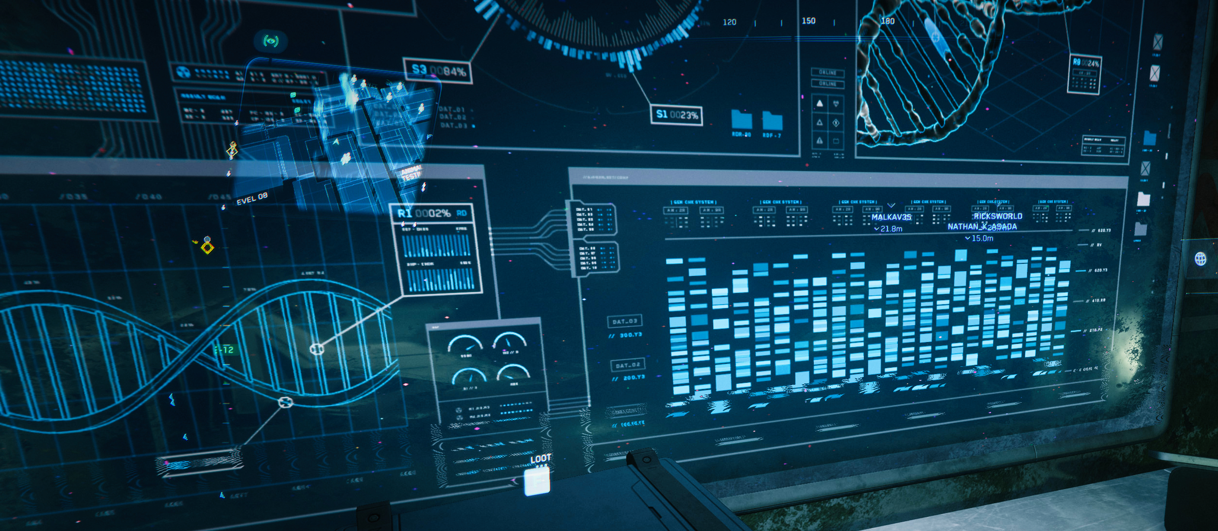 Er senkte sein Gewehr in Bereitschaftstellung "Low Ready" ab und zeigte auf einen großen Wandbildschirm. »In diesem ganzen medizinischen Kauderwelsch hier... da ist hier unten so eine seltsame Aufreihung von Codes. Sind das Gen-Sequenzen? Kannst du was damit anfangen?«