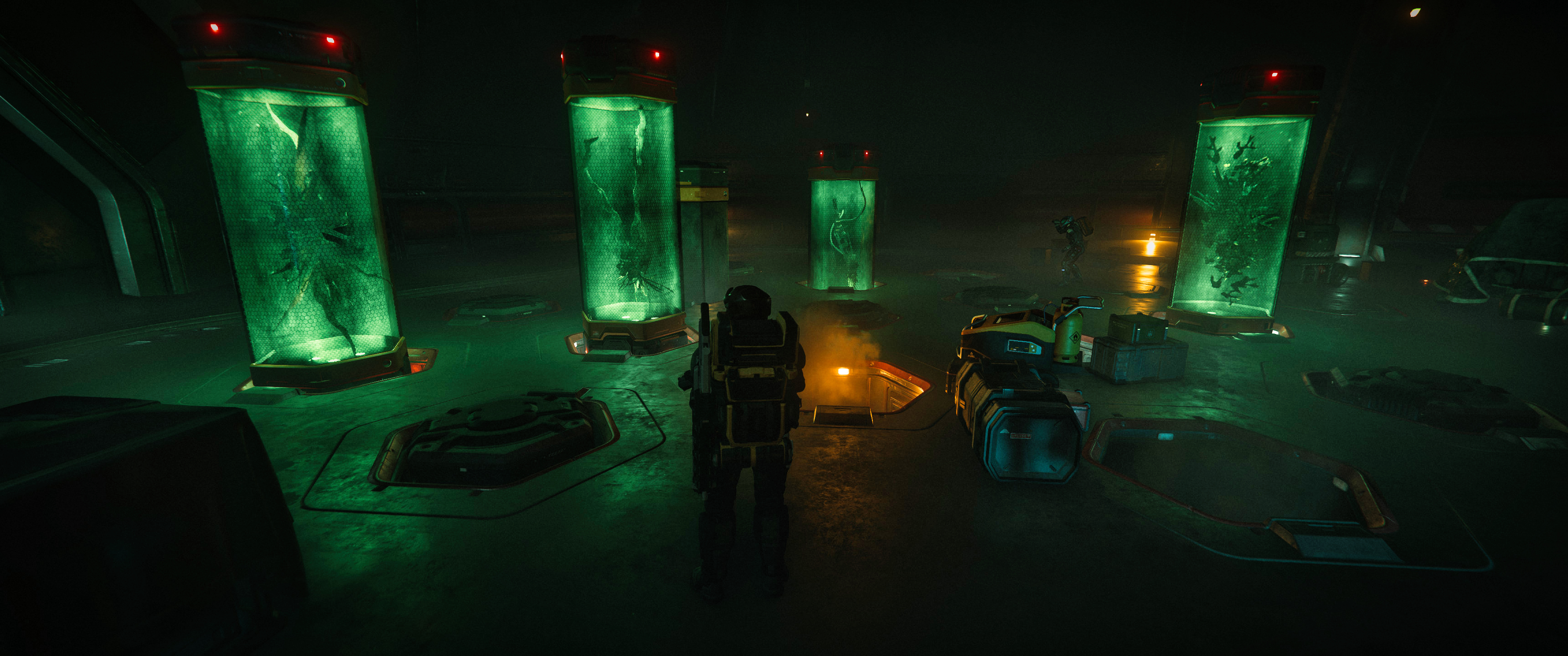 Alle waren gespannt wie ein sprichwörtlicher Flitzebogen. Wir standen wie eine große Zuschauergruppe im VIP-Bereich eines Stadions vor der Scheibe und pressten unsere Helme dagegen. Zuerst geschah gar nichts. Dann füllte ein leichter violetter Schimmer den Raum hinter dem an der Platte befestigten Vanduul-Leichnam. Plötzlich wurde die Scheibe aufgerichtet und über einen Mechanismus weiter in die Halle hineingezogen. Aus dem Schacht neben dem Vanduul schob sich einer dieser grünen Glascontainer heraus, wie wir sie in der Halle schon zuvor gesehen hatten.