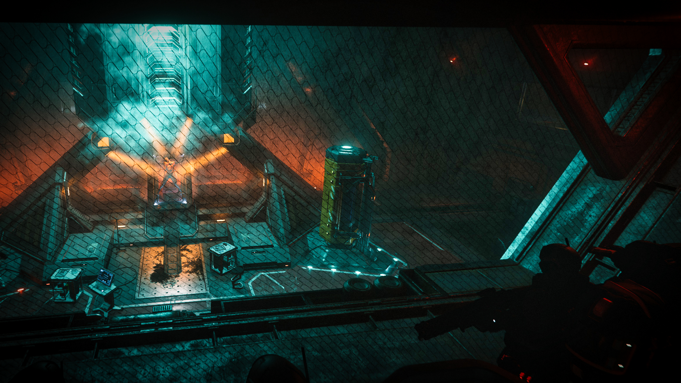 Es dauerte nicht lange, bis wir zu einer Treppe kamen, die auf eine Empore führte. Als Zero, Pike, Brubacker, Husky und ich das Ende der Treppe erreichten, fiel uns auf, dass die Söldner von Tyr in eine merkwürdige Starre verfallen waren. Bis auf zwei, die noch sicherten, waren die anderen scheinbar von einem Anblick gefangen, der sie ihre taktischen Grundlagen vergessen ließ. Wir kamen weiter auf der Empore voran und standen erneut vor einer Glasscheibe.