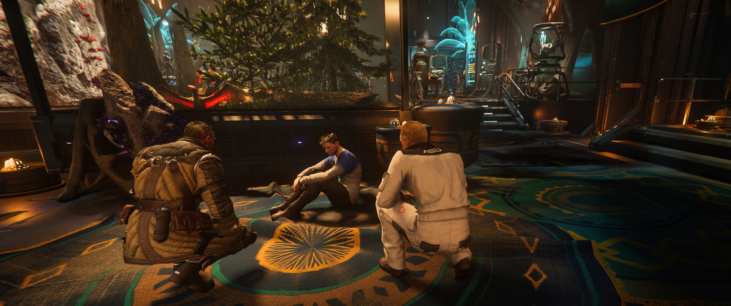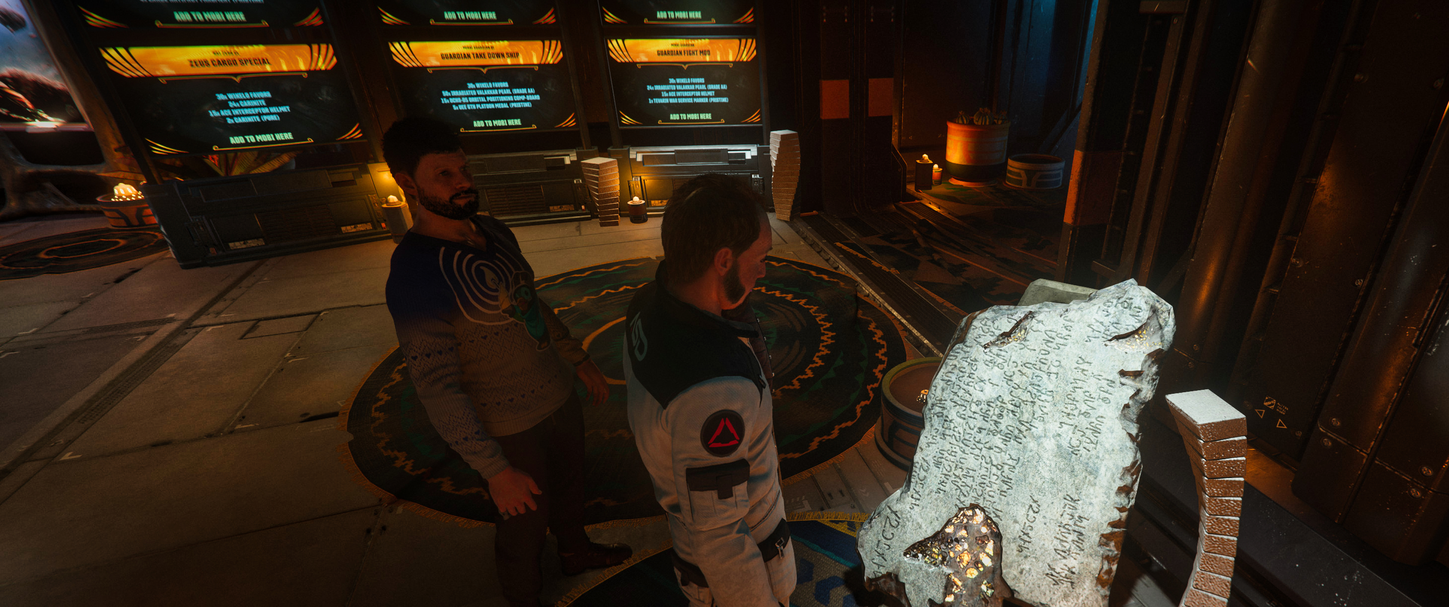 Wir nahmen in Brubackers "Shack One" Platz und machten uns auf den Weg zum Wikelo-Emporium, oder wie dieser Ort auch immer genannt wurde. Allein der Anflug war überwältigend: Ein riesiger Asteroid mitten im Leerraum des Stanton-Systems. Die Bauwerke erinnerten nicht im Entferntesten an menschliche Bauweisen. Geschwungene Formen überwogen eindeutig, im Gegensatz zu den geraden, klaren Kanten der Metallkonstruktionen, die die Menschheit in den Weltraum setzte. Es wirkte nahezu majestätisch und irgendwie auch ein wenig... wohnlich! Ich glaube, das war der richtige Ausdruck dafür. Wir landeten in einem Hangar, der dann doch von profaner menschlicher Architektur war. Selbst dieser Hangar sah definitiv nicht aus wie eine der üblichen Anlagen auf ArcCorp oder in Lorville.