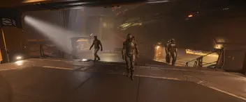 Unter meinem Helm musste ich schmunzeln. Es war wie bei meinen früheren Aufenthalten in Lorville: Auf jeden Zivilisten kam hier gefühlt ein Mann der Hurston Security. Überall begegneten uns in schwere Rüstungen gehüllte Wachleute. Ein kurzes, herrisches Nicken musste als Gruß reichen. „Keine Ehrenbezeugung, Alaska!“, mahnte Pike sofort. „Wir sind hier nicht beim UEE-Militär. Wenn du nicht auffliegen willst, bleib bei einem unterkühlten Nicken.“ Tatsächlich – es funktionierte. Jedes knappe Kopfnicken wurde von den anderen Sicherheitskräften sofort erwidert. Für einen Moment fühlte ich mich wie ein Teil eines verschworenen, dunklen Haufens. Reine Küchenpsychologie, aber wirksam, solche Rituale!