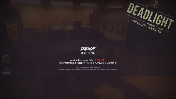 Am Montag, den 15. Dezember 2955, lädt TYRAK – das ArcCorp-Pack der Star Citizen-Organisation TYR – zu einer Luminalia-Feier im Deadlight ein.