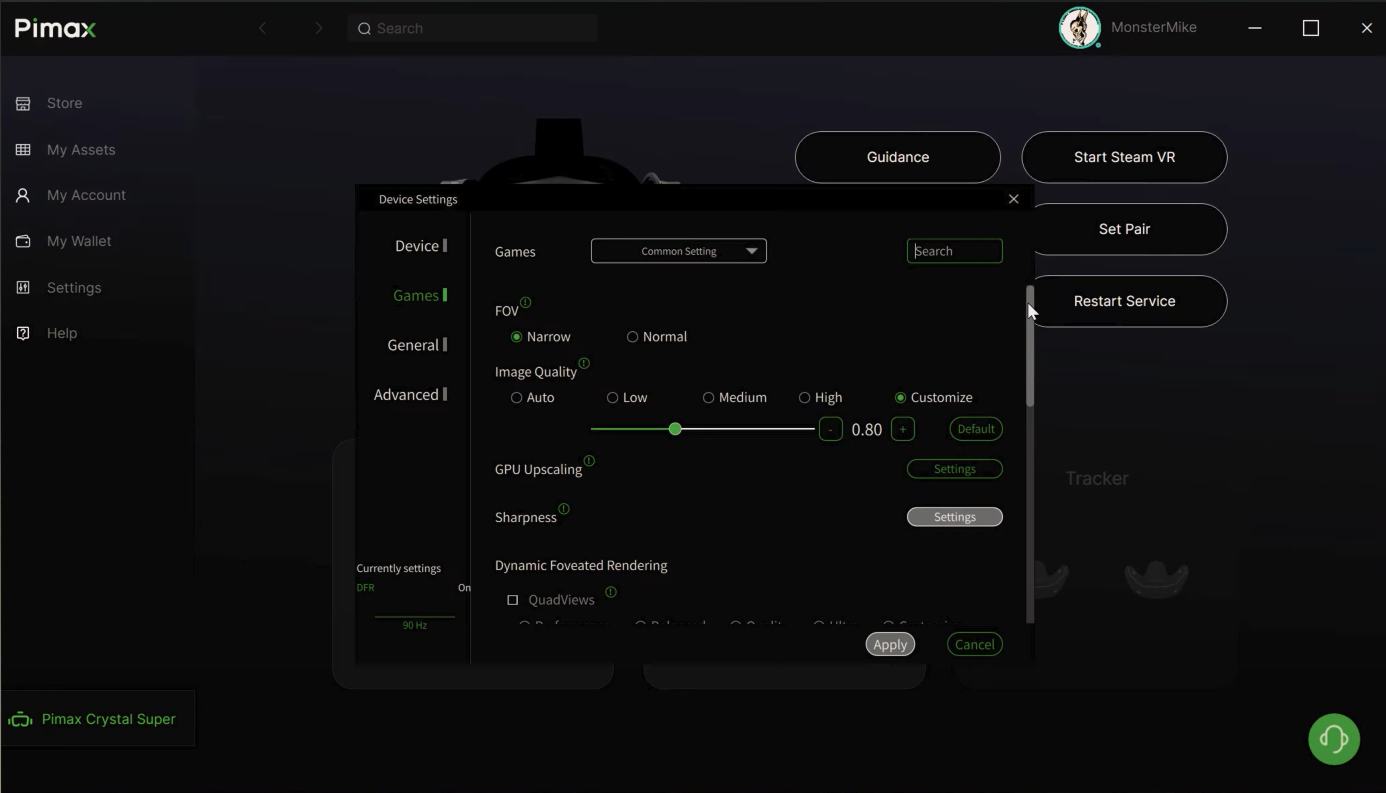 - das Headset in Pimax Play auf 90 Hz zu betreiben (alternativ 72 Hz),