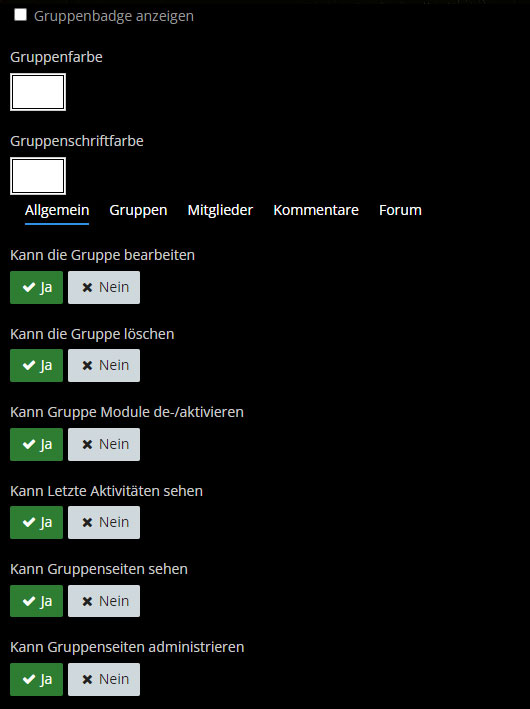 In diese Standard-Gruppe wird der Ersteller (bzw. Gründer) der Gruppe automatisch hinzugefügt und hat standardmäßig volle Kontrolle über alle Funktionen und Bereiche der Gruppe. Weitere Mitglieder können dieser Gruppe hinzugefügt werden um anderen Benutzer das Verwalten der Gruppe zu ermöglichen.