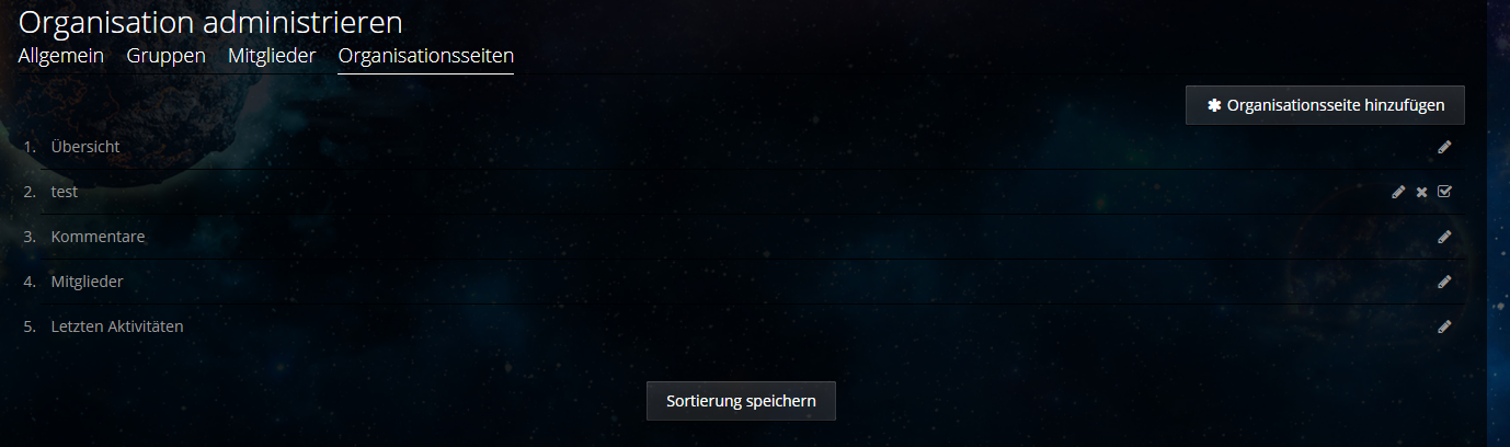 Organisationsseiten - Admin Übersicht Seiten die selber erstellt wurden, können separat deaktiviert werden. Im Screenshot unten seht ihr ein Beispiel bei dem die Seite "Test" genannt wurde.