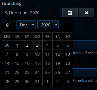 Organisation erstellen & bearbeiten - Gründungsdatum Mit diesem Eingabefeld könnt ihr das Gründungsdatum eurer Gruppe angeben. Wählt dazu den Monat und ein Jahr aus dem Dropdownmenü aus und wählt den Tag der Entstehung. Das Gründungsdatum wird in den Details der Gruppe angezeigt: Organisationsdetails - Gründungsdatum
