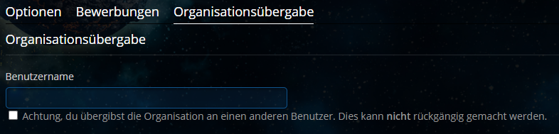 Organisations Verwaltung - Übergabe Mit dieser Option könnt ihr den Gründer der Organisation nachträglich ändern und somit an einen anderen Benutzer Übergeben. Diese Aktion kann, vom ursprünglichen "Besitzer" der Organisation, nach dem Absenden nicht rückgängig gemacht werden.