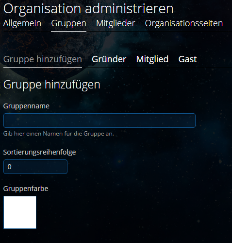 Der "Gruppenname" ist auch der Titel der im Auswahlmenü darüber angezeigt wird. (Wie z.B. Gründer, Mitglied & Gast) Die Sortierungsreihenfolge gibt vor an welcher Position die Gruppe im Menü angezeigt wird. Mit der Gruppenfarbe könnt ihr der Gruppe eine eigene Farbe zuordnen damit sie sich in der Mitgliederübersicht von den anderen Gruppen unterscheidet.