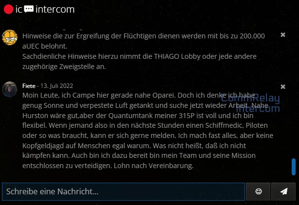 Mit unserem CommRelay bieten wir dir eine Übersichtsseite unserer InCharacter-Inhalte. Dazu zählen Funktionen & Werkzeuge mit denen sich andere Rollenspieler über einzelne Game-Sessions hinaus "anspielen" lassen, wie z.B. der Marktplatz oder die Jobbörse.