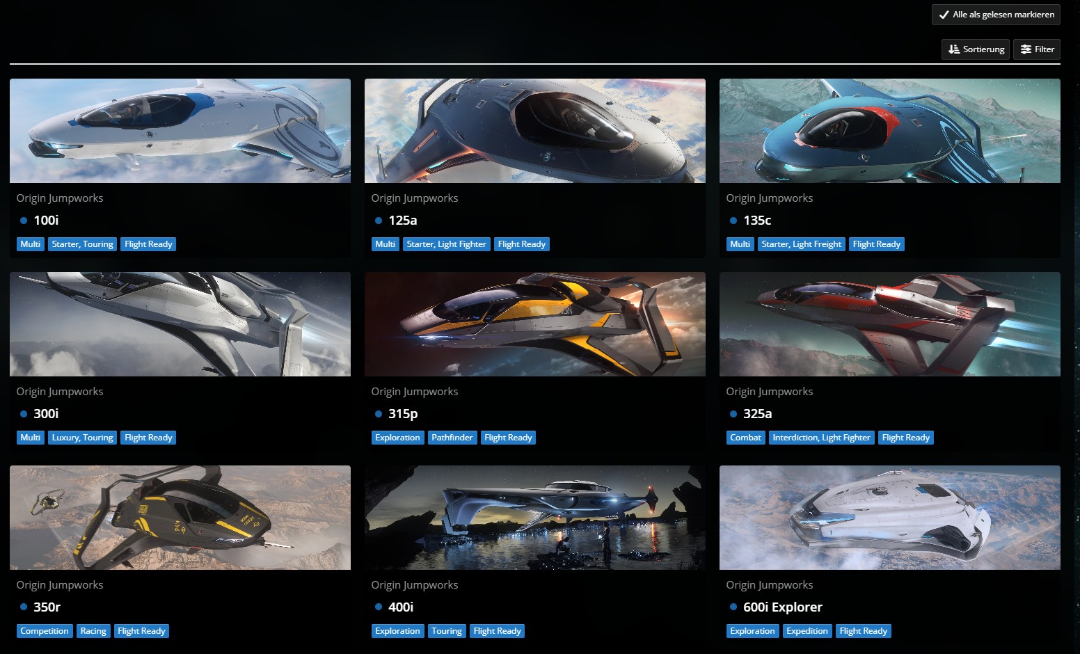 Mit diesem Button können alle aktuell als neu markierten Einträge gleichzeitig als gelesen markiert werden. Die Funktion entfernt ausschließlich die visuelle Kennzeichnung und hat keinen Einfluss auf Bewertungen oder persönliche Hangars.