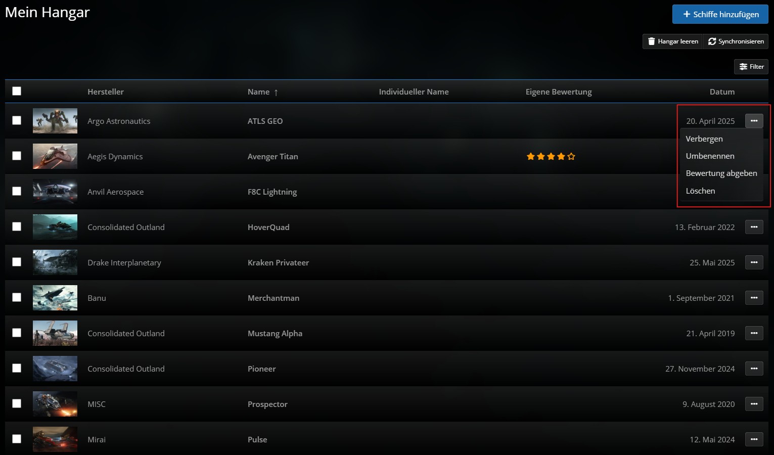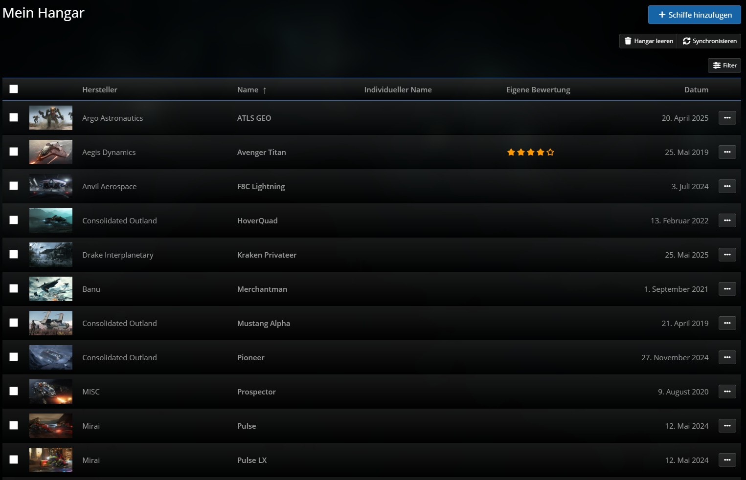 • alle im RSI-Hangar gefundenen Schiffe importiert