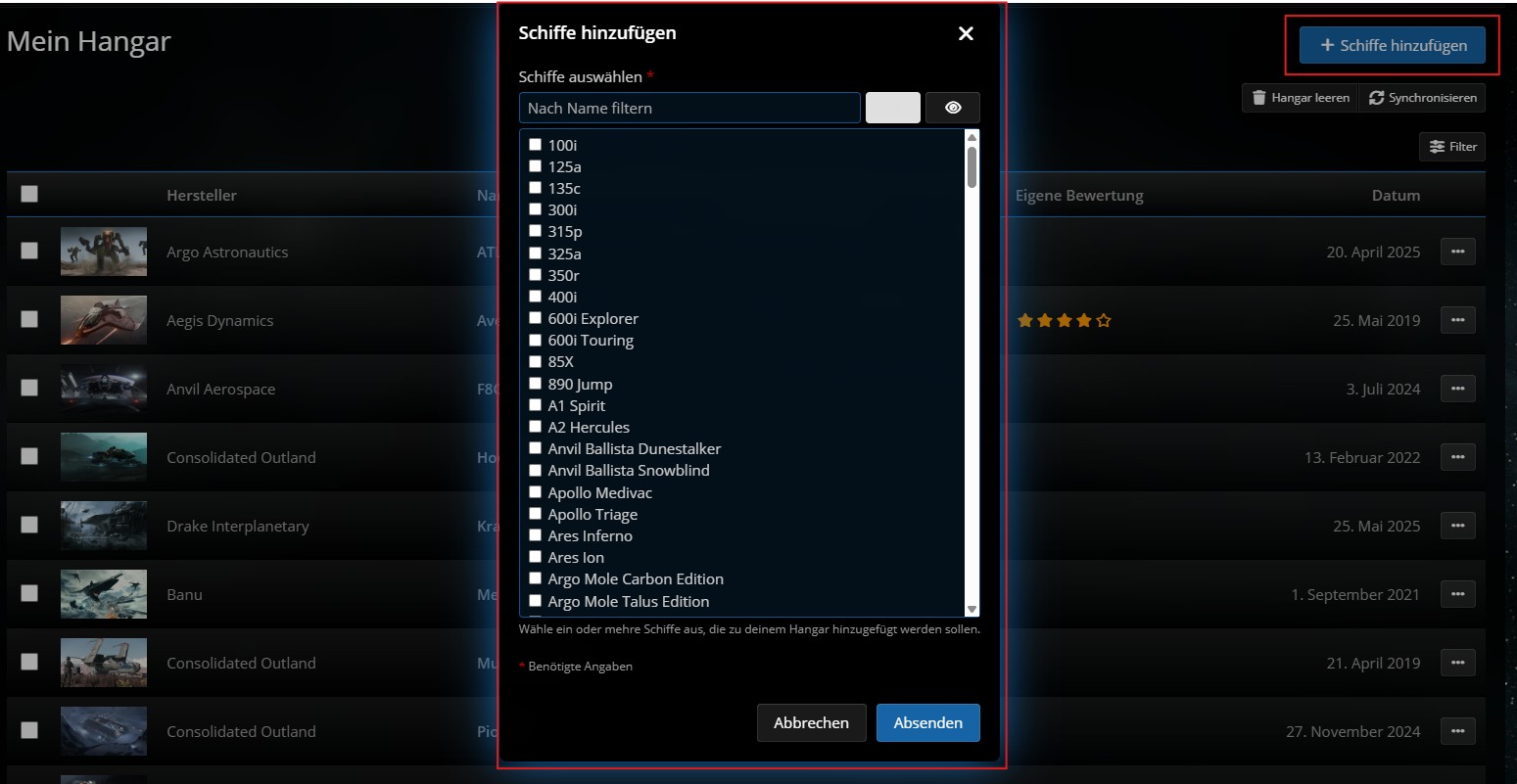 Dieser Button öffnet ein Auswahlmenü, in dem mehrere Raumschiffe und Fahrzeuge gleichzeitig manuell dem eigenen Hangar hinzugefügt werden können.
