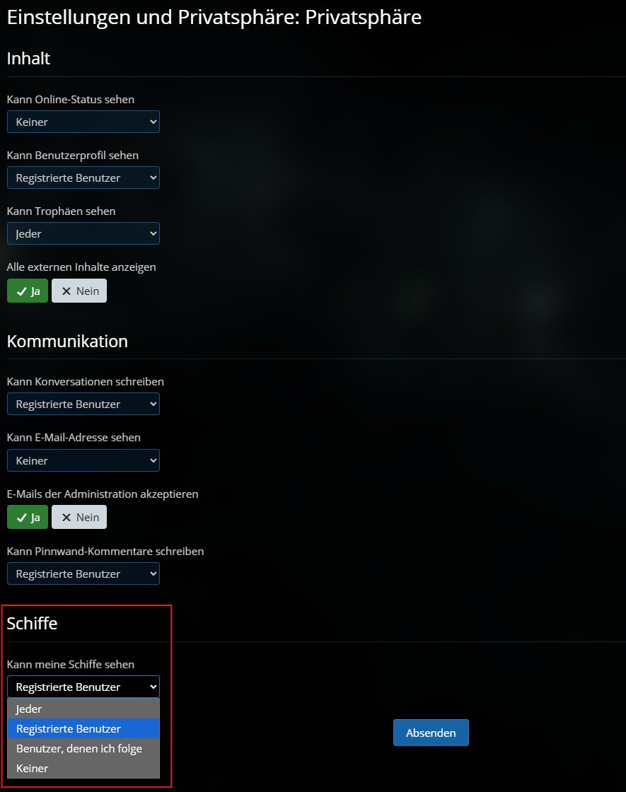 Die Sichtbarkeit der eigenen Raumschiffe lässt sich im Benutzerprofil unter den Privatsphäre-Einstellungen individuell steuern.