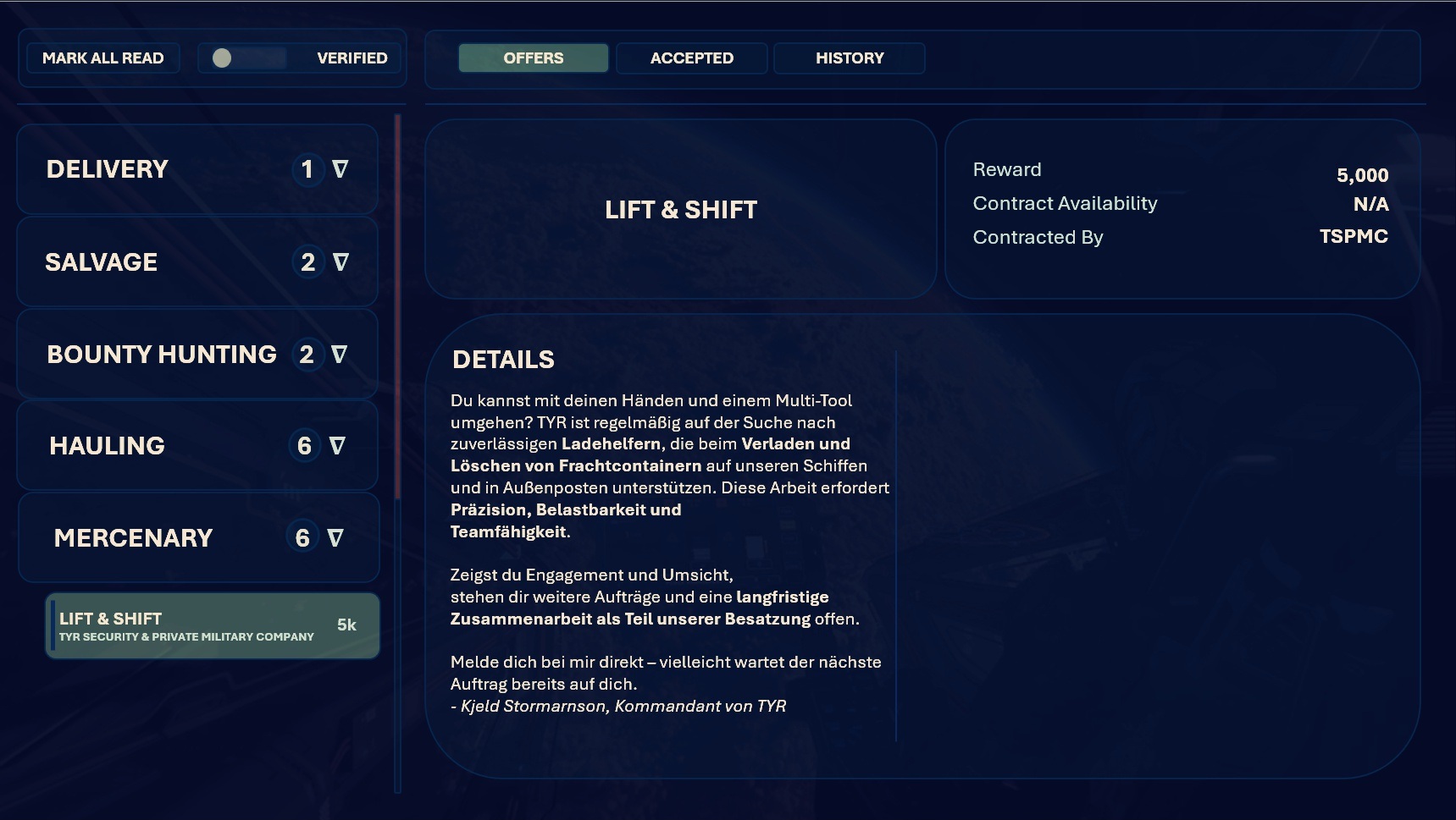 Du kannst mit deinen Händen und einem Multi-Tool umgehen? TYR ist regelmäßig auf der Suche nach zuverlässigen Ladehelfern, die beim Verladen und Löschen von Frachtcontainern auf unseren Schiffen und in Außenposten unterstützen. Diese Arbeit erfordert Präzision, Belastbarkeit und Teamfähigkeit.