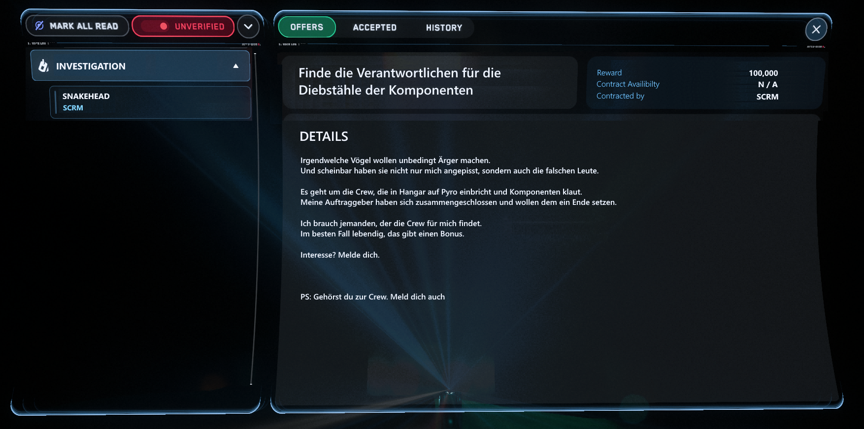 Es geht um die Crew, die in Hangar auf Pyro einbricht und Komponenten klaut. Meine Auftraggeber haben sich zusammengeschlossen und wollen dem ein Ende setzen.