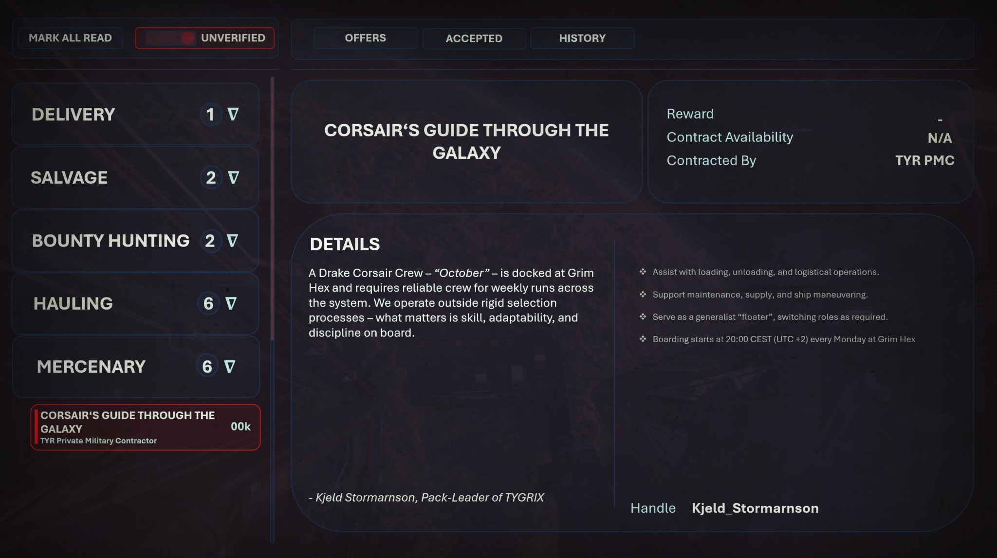 Mindestens einmal pro Woche läuft die Drake Corsair NSV von ihrem Heimathafen Grim Hex aus. Was „October“ besonders macht: Wir folgen keinem starren Auswahlverfahren. Stattdessen heuern wir je nach Auftrag wechselnde Kräfte an – ob Verlader oder Tagelöhner, die Ladung bewegen, löschen oder logistische Aufgaben übernehmen. Herkunft, Vergangenheit oder Verfehlungen spielen keine Rolle. An Bord zählt allein, dass du funktionierst – deine persönlichen Probleme bleiben draußen.