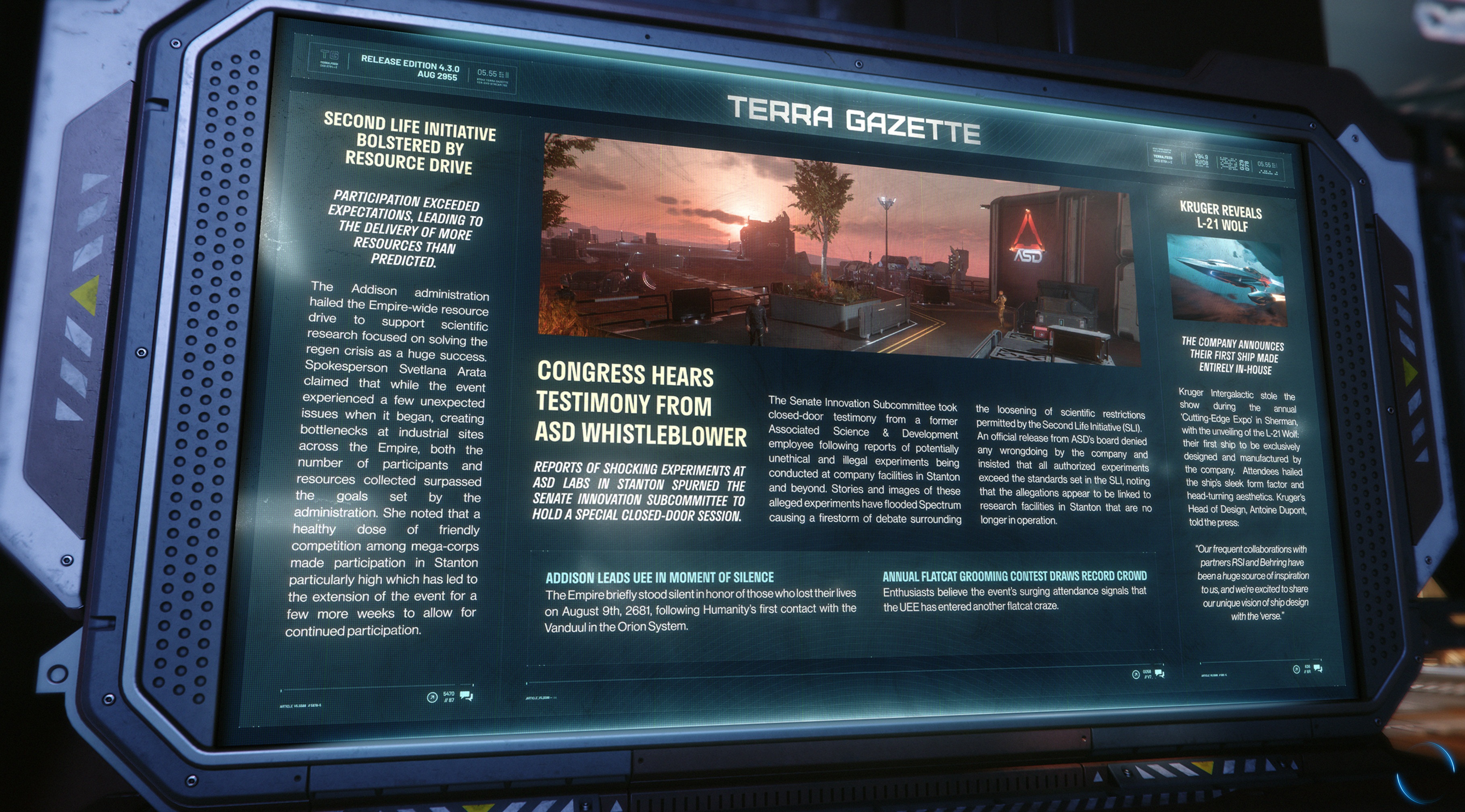 ZitatDer Innovationsausschuss des Senats nahm hinter verschlossenen Türen die Aussage eines ehemaligen Mitarbeiters von Associated Science & Development entgegen, nachdem Berichte über potenziell unethische und illegale Experimente in Einrichtungen des Unternehmens in Stanton und darüber hinaus bekannt geworden waren. Geschichten und Bilder dieser angeblichen Experimente überschwemmten Spectrum und lösten eine heftige Debatte über die Lockerung wissenschaftlicher Beschränkungen im Rahmen der Second Life Initiative (SLI) aus. In einer offiziellen Stellungnahme wies der Vorstand von ASD jegliches Fehlverhalten des Unternehmens zurück und betonte, dass alle genehmigten Experimente die im Rahmen der SLI festgelegten Standards übertreffen würden. Zudem wurde hervorgehoben, dass die Anschuldigungen offenbar mit Forschungseinrichtungen in Stanton in Verbindung stünden, die inzwischen nicht mehr in Betrieb seien.
