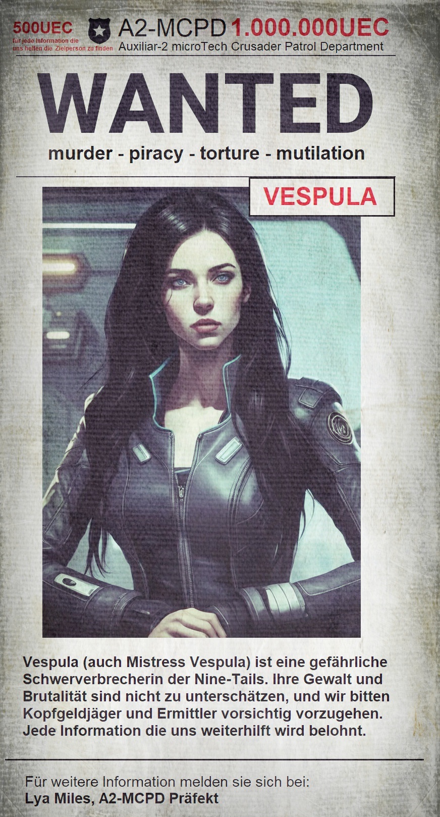 In einer dringenden Bekanntmachung erhebt die A2MCPD unter Leitung von Präfekt Lya Miles schwere Anschuldigungen gegen eine der berüchtigtsten Kriminellen im gesamten Stanton System, Mistress Vespula. Als langjährige und gefürchtete Anhängerin der Nine-Tails hat Vespula unzählige Verbrechen begangen und sich durch ihre kriminelle Expertise und ihre gewaltsame Natur einen Namen gemacht.