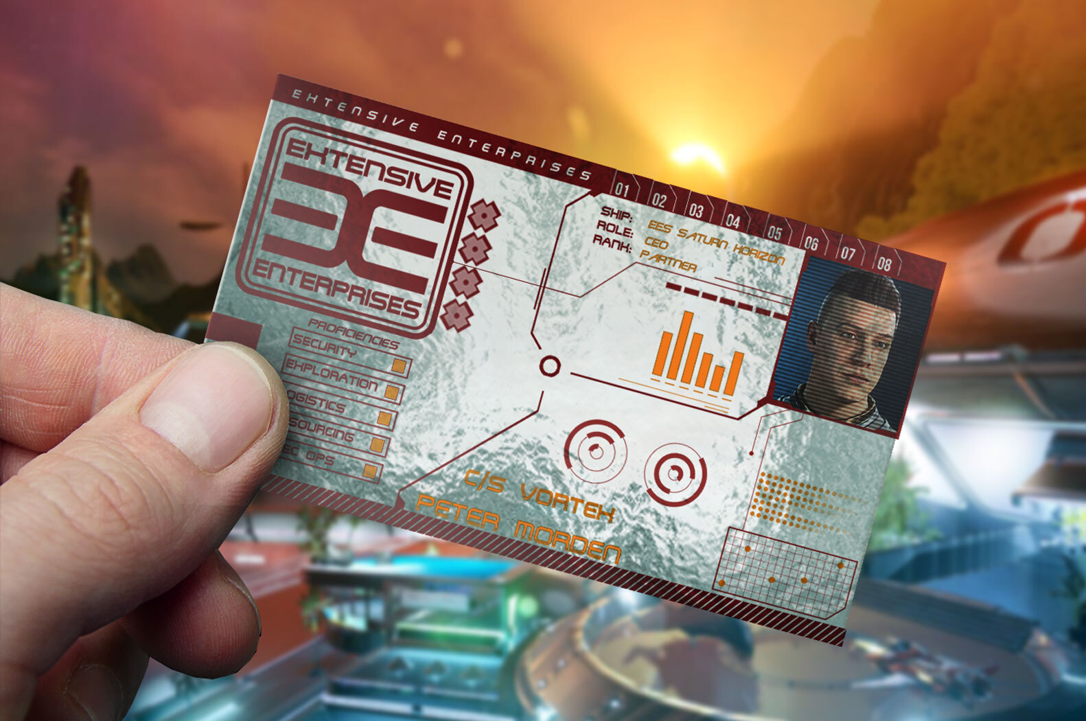 Peter „Vortex“ Morden (UEE-VTEX_13; 42, Sol) ist Ex-UEE-Scout und Naval-Intelligence-Pilot, heute Privateer, Trader und CEO von Extensive Enterprises. Nach der Übernahme des Familienbetriebs und dem Umzug ins Goss-System spezialisierte er das Unternehmen auf den Betrieb großer Spezialschiffe für Exploration und Mission-Support. Das Unternehmen hat heute knapp 2000 Mitarbeitende und über 600 Schiffe. Als Teamchef von Extensive Racing und Pilot des Supportschiffs konnte er bisher drei erfolgreiche Daymar Rallys abschliessen.